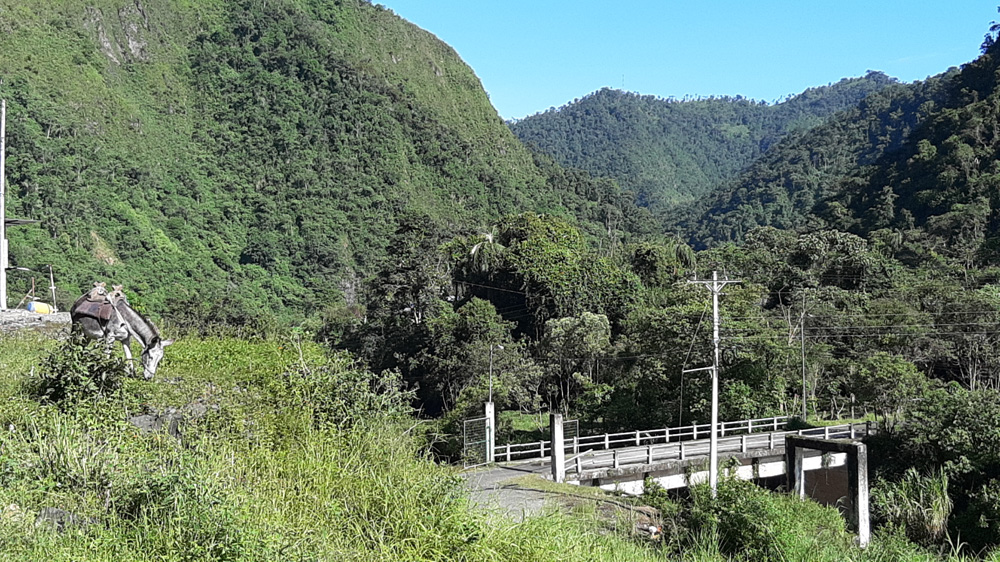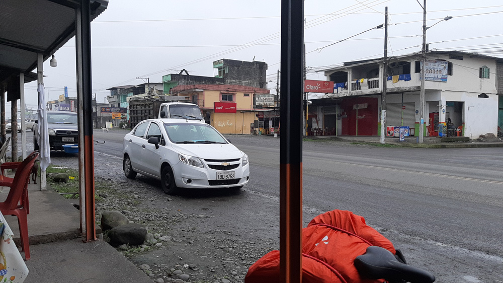 Heute bin ich bis Buena Fe gefahren, eine Durchgangsstraße in Richtung Guayaquil, stark befahren. Morgens Busse, die auf Handzeichen anhalten, im Eingang oft ein Einweiser, der sich bei offener Türe gut festhält. Es ging gut voran, die Temperatur stieg.