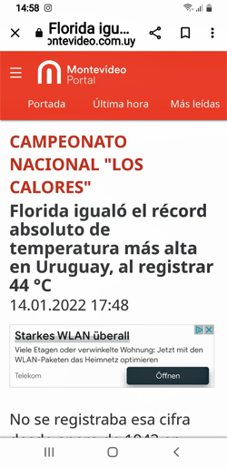 Es war die höchste Temperatur, die je in Uruguay gemessen wurde - in Florida - an meinem Übernachtungsort - und - die ich je in meinem Leben erlebt hatte! In Somalia war es heiß / warm / feucht - stets um die 30 Grad und es bließ der Wind aus Meeresrichtung. In meiner Tasche hatte ich ja ein Messgerät - 45,6 Grad - gut - in der Tasche. Ob dies der einzigste Grund war für meinen Abbruch - oder meine Beine, sie schmerzten bei Anstiegen? Uruguay ist nicht bergig, aber hügelig - und das andauernd!. Noch zwei Wochen danach, ich spazierte durch die mit dem Auto besuchten Orte und dachte an die erlebte Hitze und schon bekam ich "Hitzewallungen" oder was weiß ich - ein Trauma? Die Entscheidung war richtig - ich lebe noch! In Montevideo angekommen - Busstation - musste ich noch ca. 3 km zu Hostal radeln. Abends dann ein freudiges Wiedersehen auf dem Dach des Hostals. |