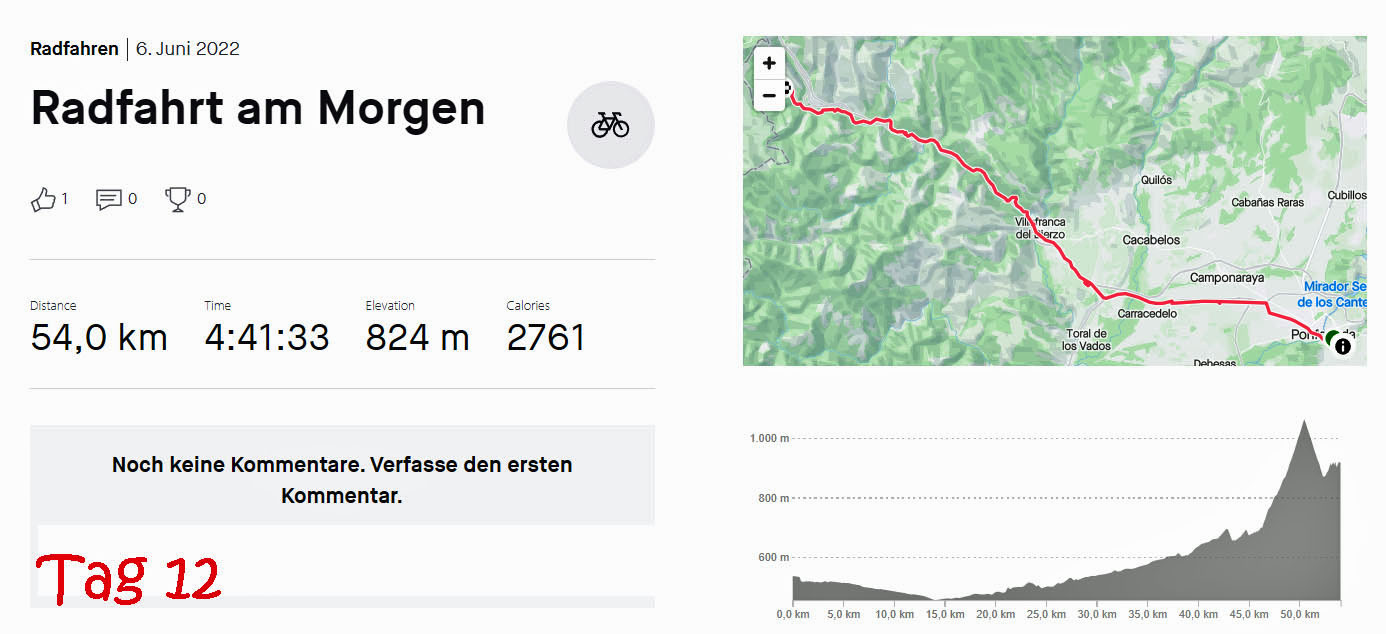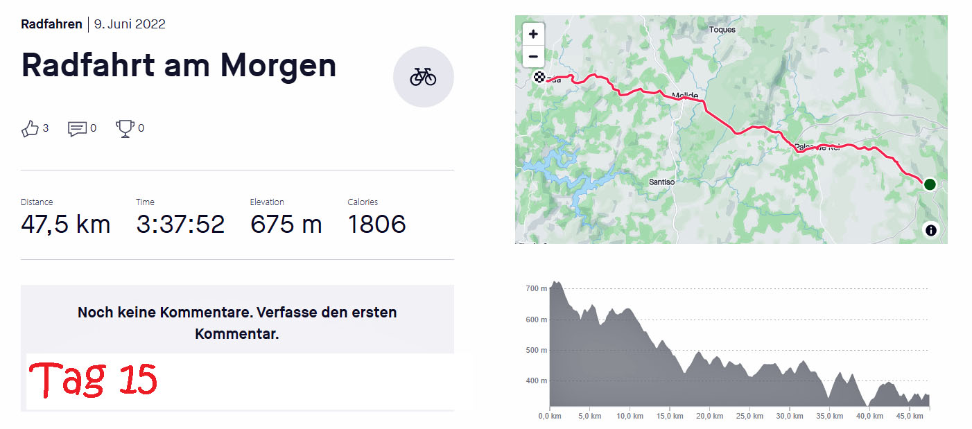 14.Fahrtag 46,2 km 890 4h26 Von Sarria über Portomarin bis zu Ventas de Narón gefahren. Da die eigentliche Strecke zu kurz war, fuhren wir weiter und wichen damit erstmals von unserem Reisebuch ab.