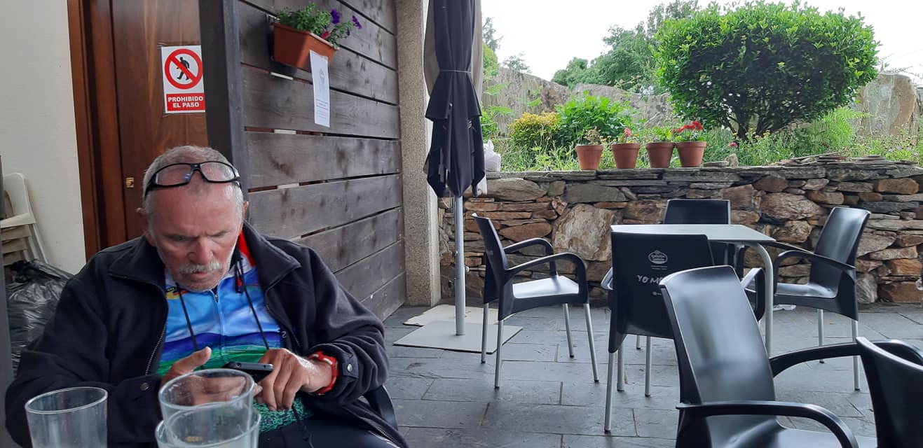 15. Fahrtag 47,5 km 675 Hm 3h37´ Ventas de Narón bis Arzua eigentlich wollten wir noch etwas in Richtung Santiago de Compostella fahren, doch ein kleines Kippen des Rads von Hans verhinderte dies. Nach einem Hotel „Suiza“ nach ca. 800 Meter fuhr Hans mit seinem rechten Hinterreifen leicht in einen Graben und rutzsche in diesen hinein. Er konnte nicht sich selbst aus der misslichen Lage befreien, Autofahrer*innen hielten an, ich wartete nach einer Kurve, konnte das Geschehen nicht verfolgen, bis eine Fahrerin mir Bescheid gab. Wir halfen Hans auf, es schien ihm nichts passiert zu sein. Ein Dame hatte aber schon den Rettungswagen angerufen, er kam bald und auch die Polizei. Wir entschieden Hans mit Taxi zurück an das nächste Hotel zu fahren, ich mit Rad, Taxi wieder zum zweiten Rad und wieder damit zurück zum Hotel. Abends gingen wir zu Fuß in den nahegelegenen Ort.